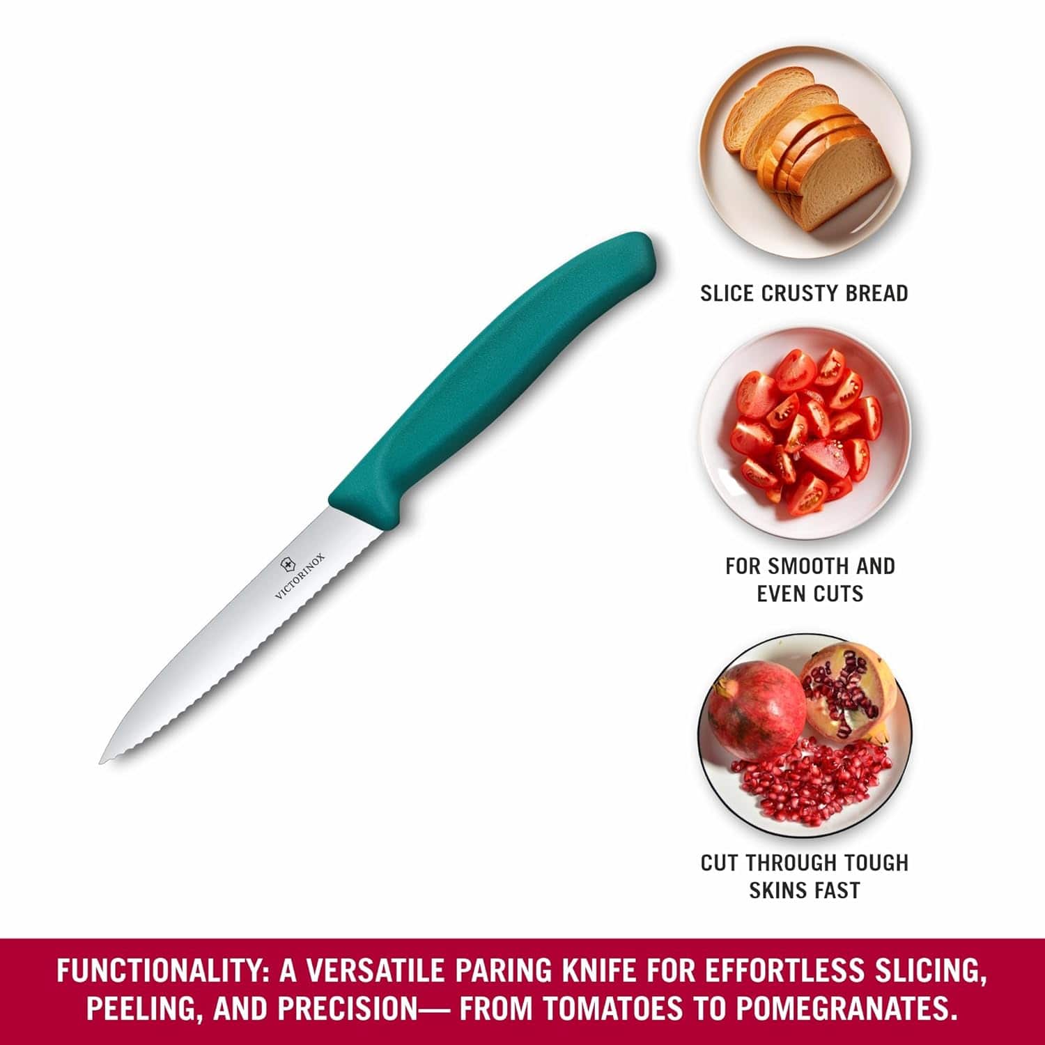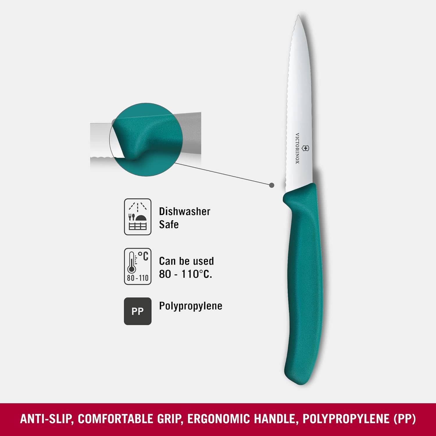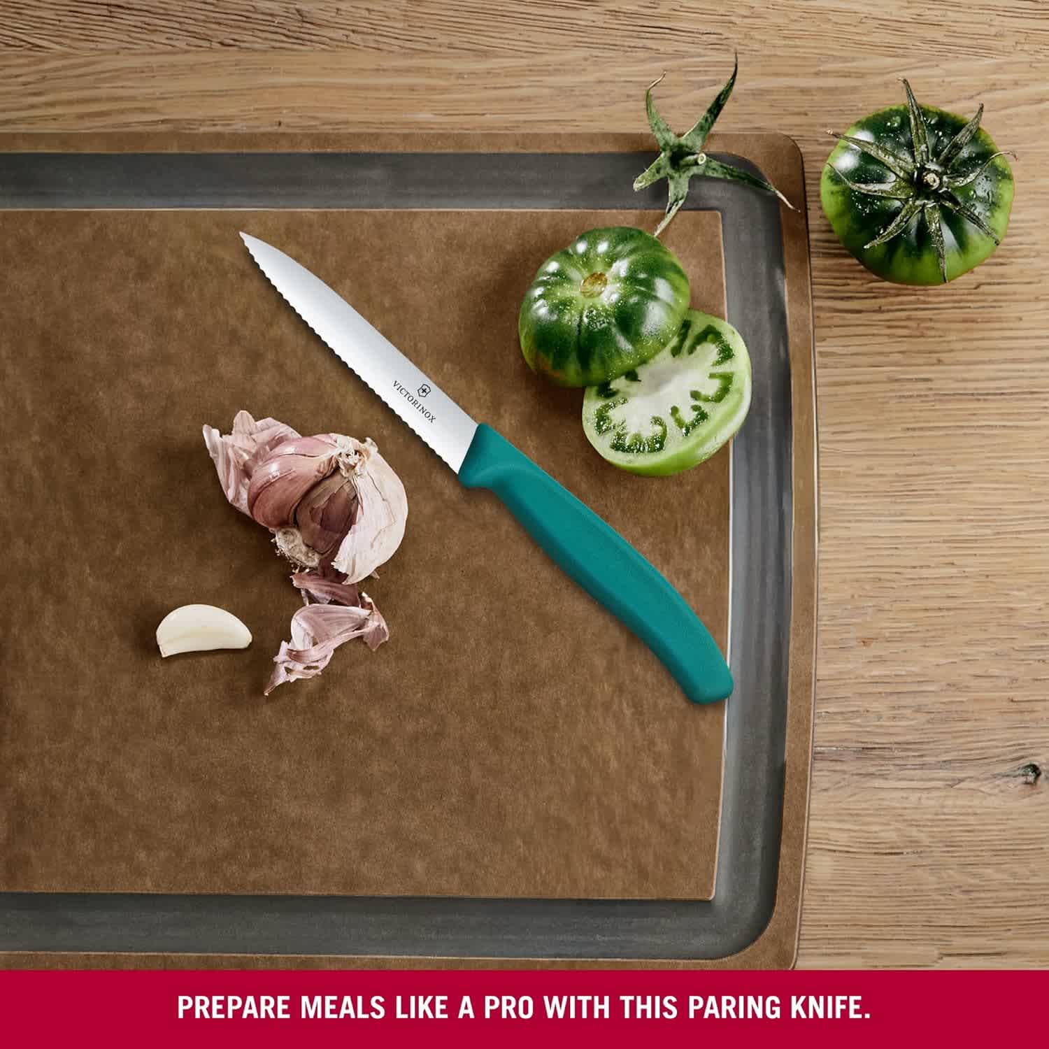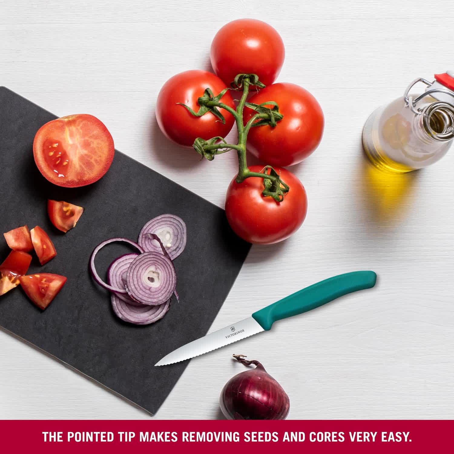 The Victorinox Paring Knife is an exceptional tool for tackling tasks that require precise and intricate cuts. Designed to be an all-purpose blade, the paring knife is like the younger brother of the popular chef’s knife. Great for peeling and slicing vegetables, the serrated edge of this little devil lasts longer and doesn’t need to be used on a chopping board. Super effective for quick, clean hand-held work! Stamped construction provides a lighter, thinner blade and the 4″ length tip to handle is perfect for deveining shrimp, sectioning fresh fruits, and detailing dough or desserts. A white polypropylene handle is slip-resistant, lightweight, and comfortable, making it easy to use this paring knife for countless food prep assignments.